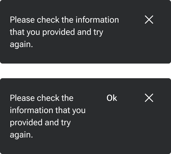 If you need to customize your own action area, use the base notification buttons instead of the default design system button. The notification buttons represent styling overrides that are in place to ensure appropriate color contrast against the notification backgrounds.
